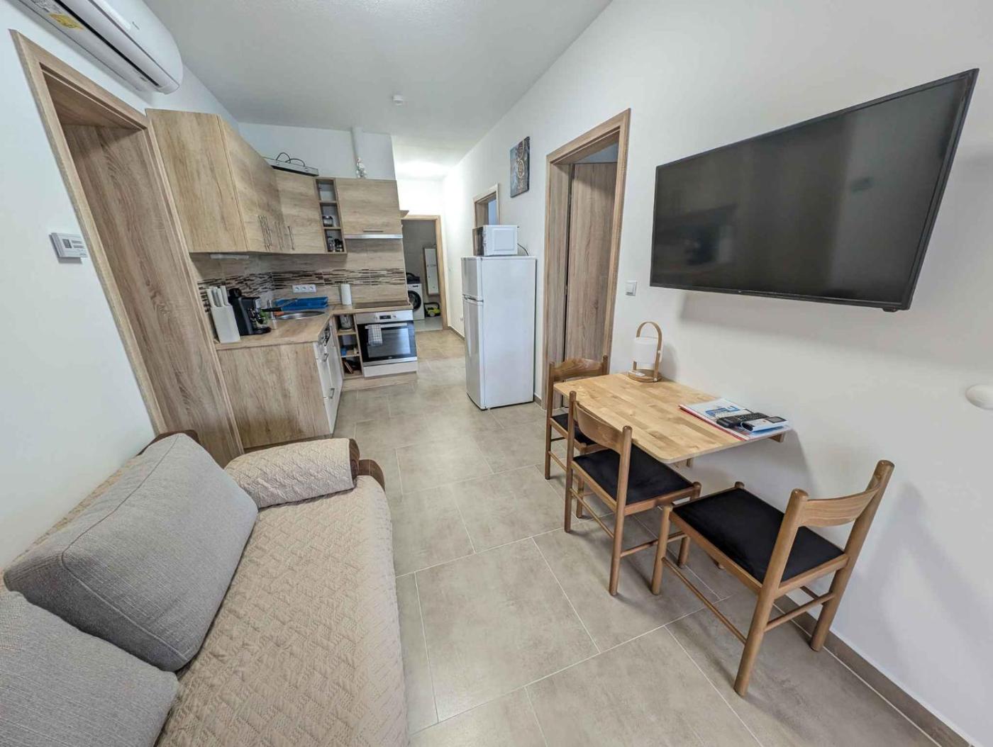 The air-conditioned holiday home consists of 2 bedrooms, a living room, a fully equipped kitchenette with a microwave and a kettle, and 1 bathroom with a shower and a hair dryer. A TV is featured.
