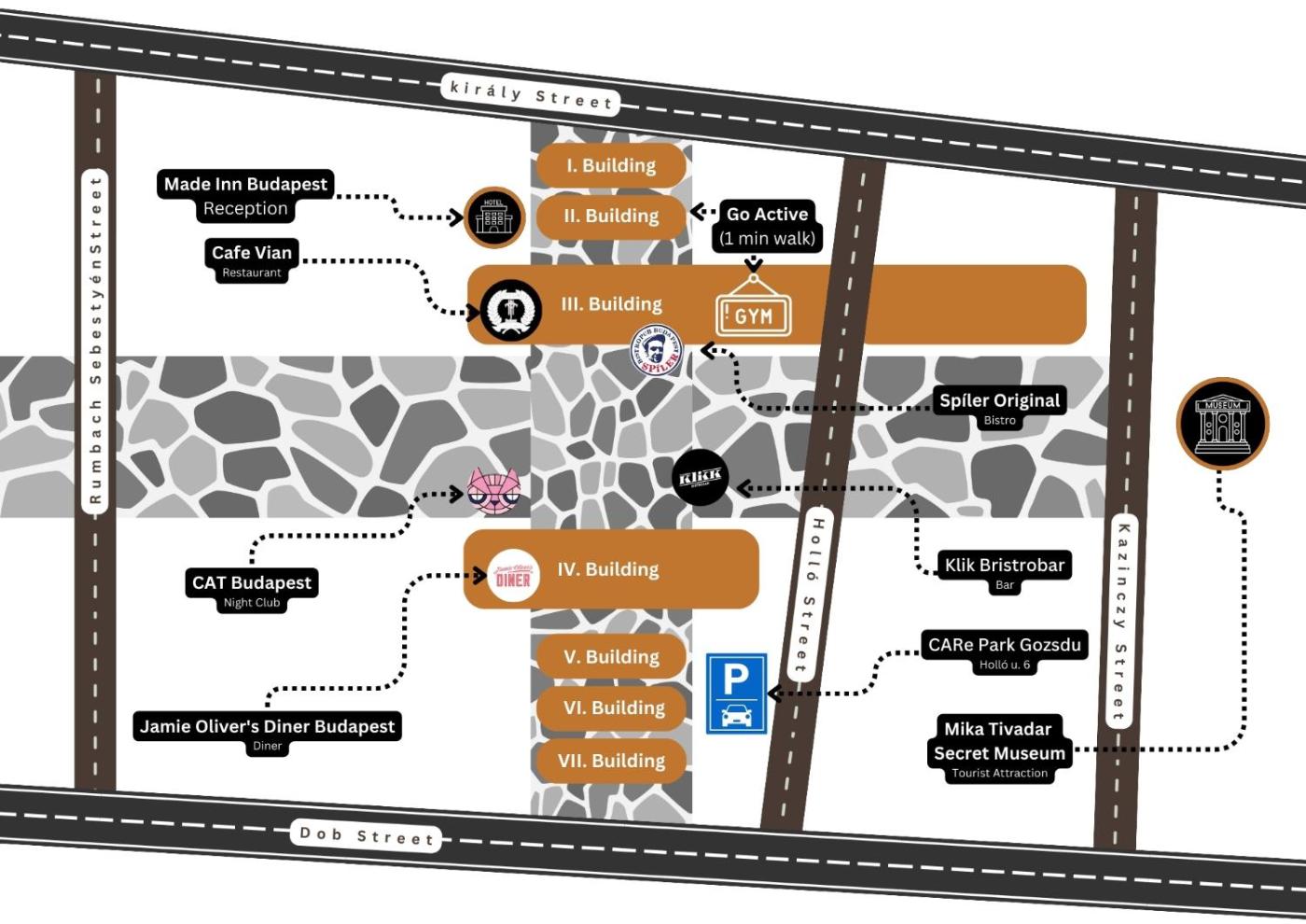 The modern Made Inn Budapest is located in the Gozsdu Court, right behind the Great Synagogue and a 5-minute walk from the Deák Ferenc Square.apartments are soundproofed and feature free WiFi. Various bars are at the same building.